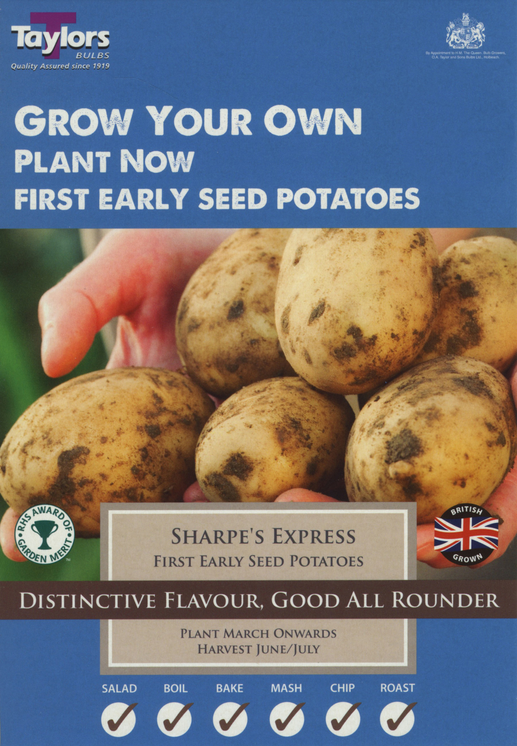 10 Sharpe's Express, first early seed potatoes. Distinctive flavour and a good all-rounder. Plant March onwards and harvest June/July. Suitable for: salad, baking, chips, boiling, mash and roast.