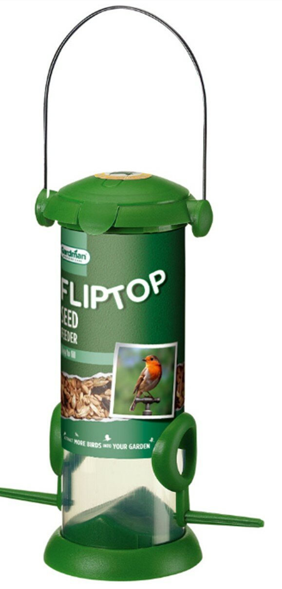 Gardman Flip Top Seed Feeder is a durable, plastic feeder for all types of bird seed, sunflower seed and peanut bites. Flip top lid for easy filling and cleaning. 20cm.