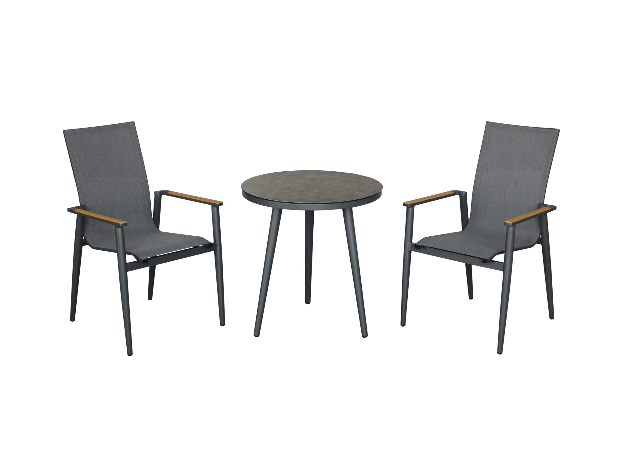 The Sofia 80cm Round Bistro Set, featuring two armchairs in a sleek anthracite finish, brings a modern touch to compact spaces. Perfectly suited for balconies or small gardens, its contemporary design stands out. The armchairs are crafted with stackable Textilene, ensuring easy and convenient storage when not in use.
