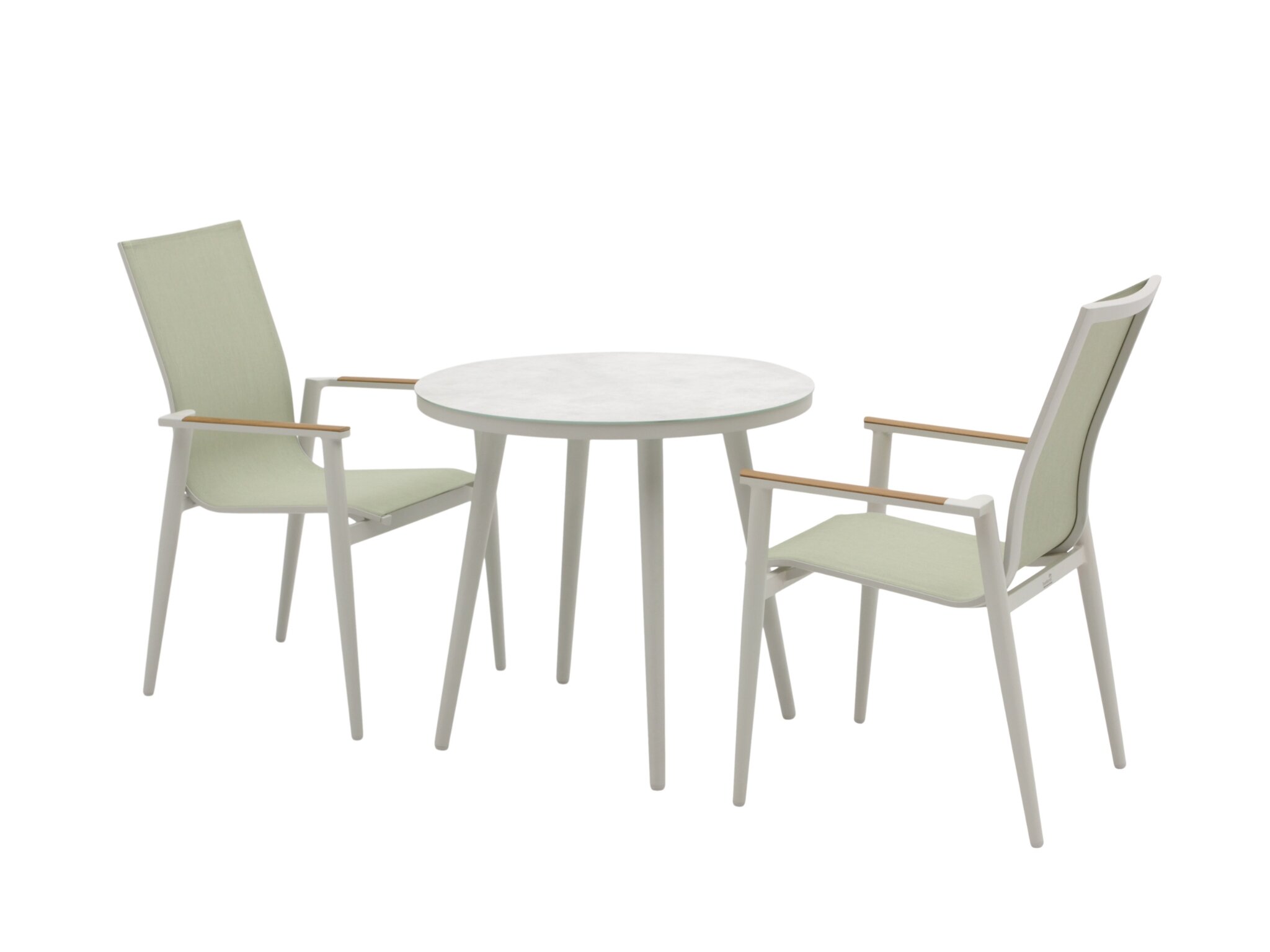 The Sofia 80cm Round Bistro Set, featuring two armchairs in an elegant green, perfectly combines practical comfort with a chic, modern aesthetic. Designed with smaller spaces in mind, this set offers the added convenience of stackable chairs without sacrificing style.
