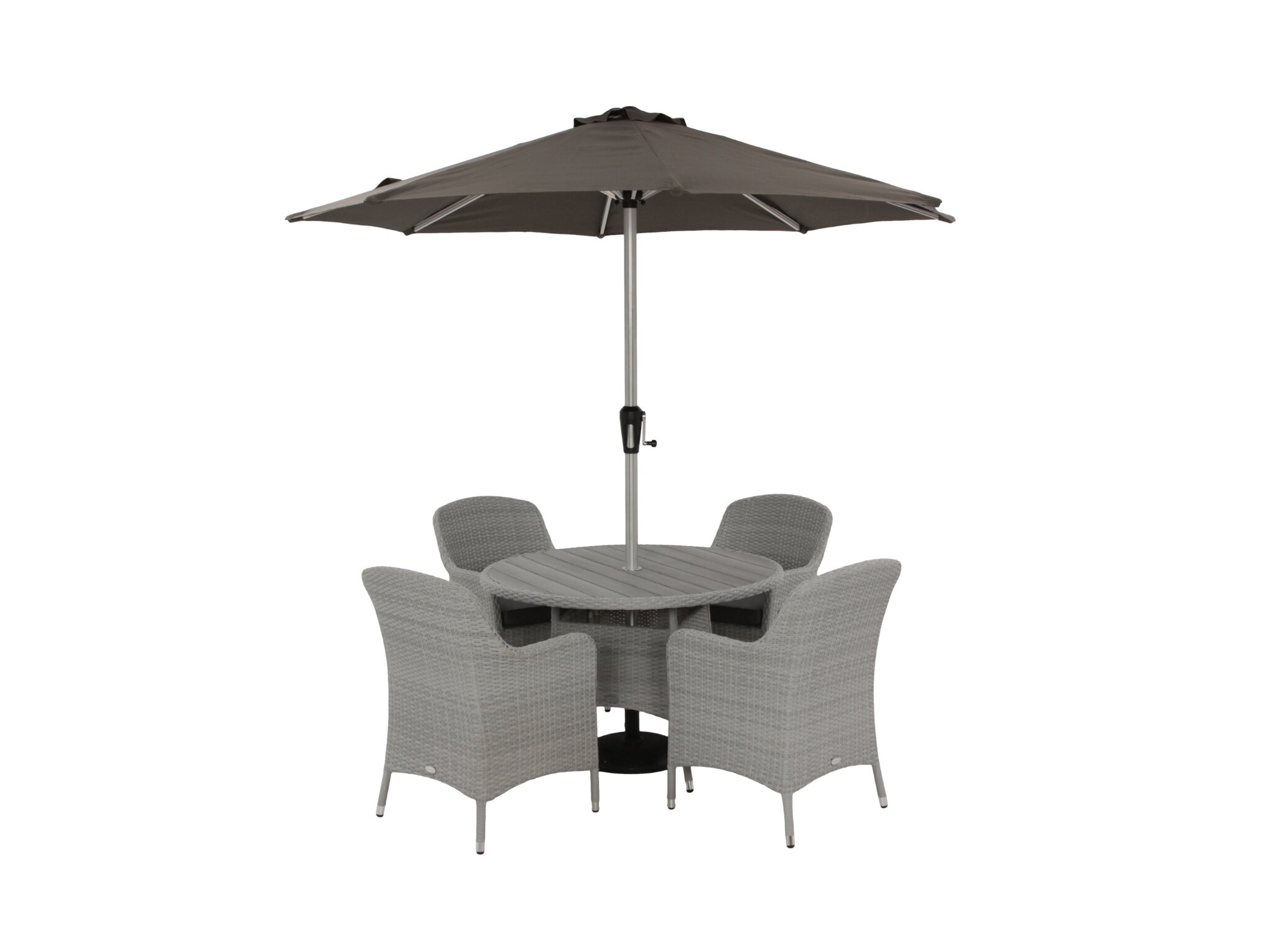 Introducing the Tetbury 110cm Round Dining Set—an elegant blend of classic charm and modern functionality. This set features four comfortable armchairs and a coordinating parasol and base, all crafted in stylish graphite rattan. The season-proof Eco Smoke cushions provide both comfort and durability, making it perfect for outdoor gatherings. The Tree-Free tabletop adds an eco-friendly touch, ensuring your garden dining experience is both relaxed and environmentally conscious.