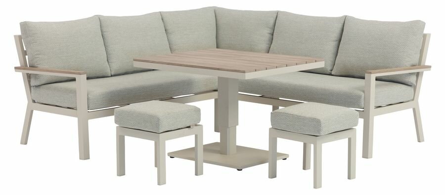 Ideal for cozy spaces and intimate gatherings, this Zurich corner sofa set offers exceptional convenience in a compact design. The set features a versatile table with an easy-to-operate lever, allowing seamless transitions between coffee table and dining heights. The tabletop boasts a tree-free design, mimicking the appearance of real wood while remaining lightweight and easy to maintain. Additionally, the set includes two stools that can be neatly stored away when not in use, enhancing its space-saving appeal.